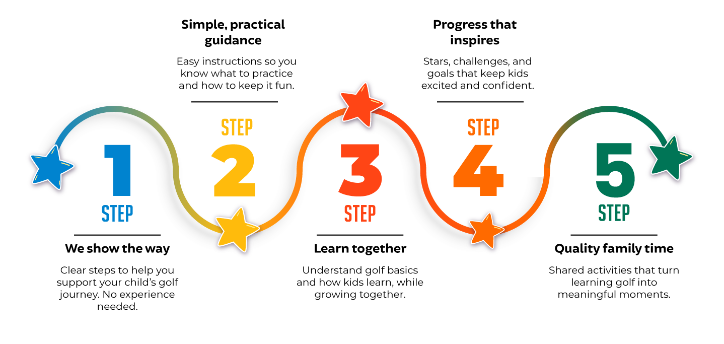 Golf In Colors offers a structured learning system made up of playful programs and tools designed to support both kids and parents throughout the learning journey. Each program has a clear purpose, helping children learn golf step by step while parents understand how to guide, motivate, and support their progress at every stage.